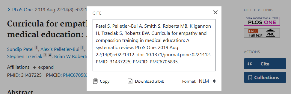 For editorial citations for journal articles, please use the National Library of Medicine (NLM) citation style. An easy way to guarantee the citation is formatted correctly is to use PubMed to look up the article, click the “Cite” button on the right, and choose NLM in the bottom left corner when the citation box appears. Then just copy and paste.